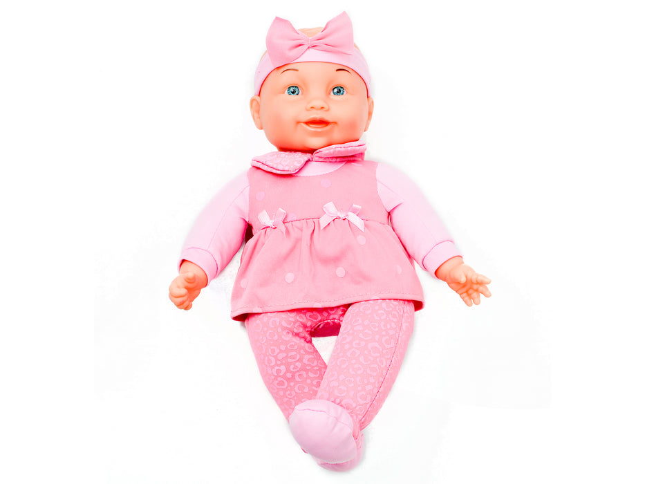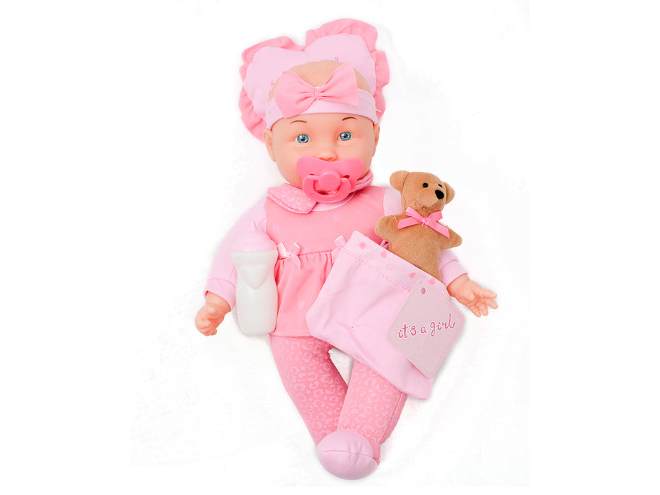 - Adorable 14-inch doll with pink pants and a pink bow hat