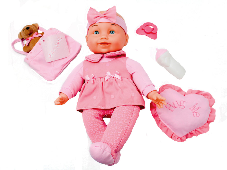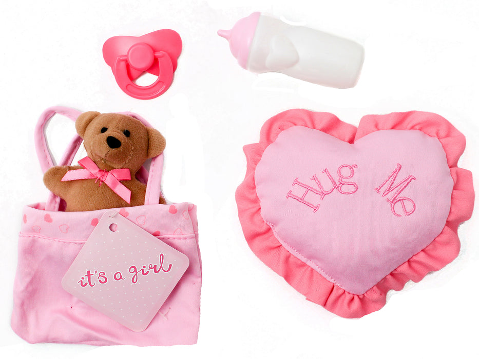- Sweet "Hug Me" pillow, milk bottle, pacifier and carry bag